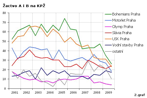 První graf zachycuje rozložení počtu startujících plavců na pražských KPŽ. U nejmladšího žactva jsou počty starujících značně rozkolísané, ale nesignalizují nějaký vyrazný propad. Reorganizace závodů v roce 2007 měla samozřejmě dopad na počty startujícíh v závodu, ale rok 2009 naznačil, že celkový pokles bude výrazný. Z druhého grafu je pak zřejmé, že největší propad v počtu starujícíh je u plavců ze sportovních tříd. Je vyšší jak 50%.